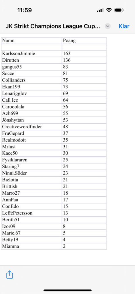 Aktuell ställning i JK Strikt Champions League efter november 2024